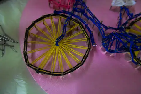 • Use colourful threads to weave around the nails and slowly bring your design to life.