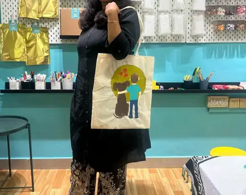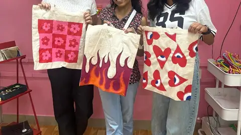 • Participants work on painting their personal tote bags with step-by-step support and guidance throughout.