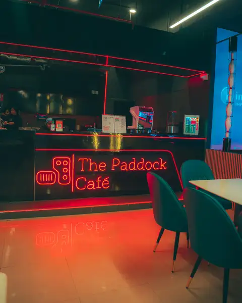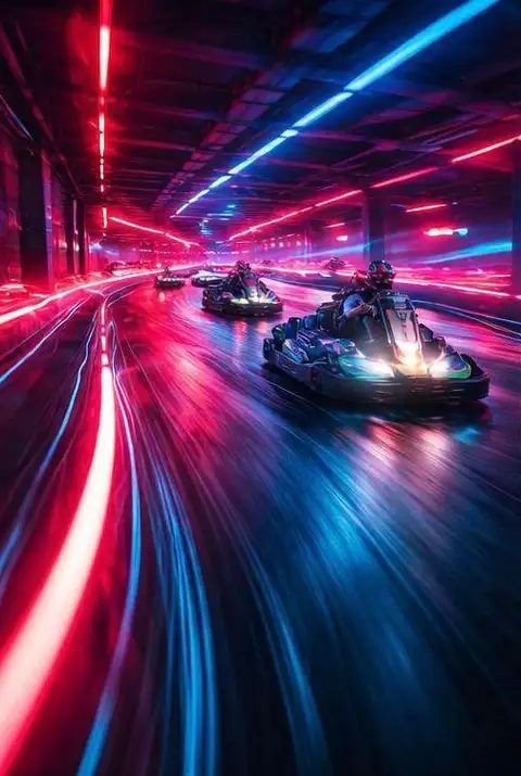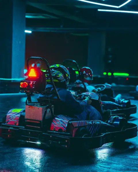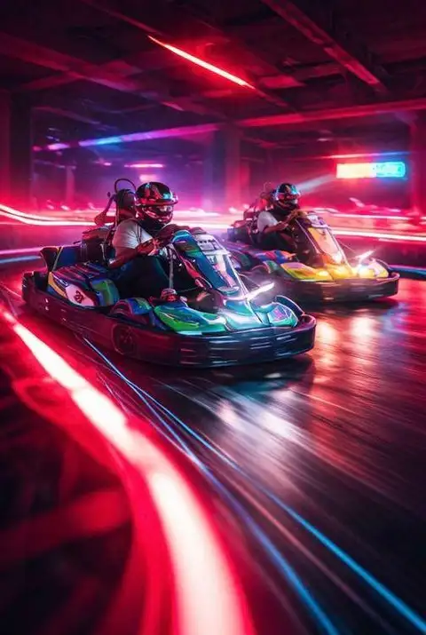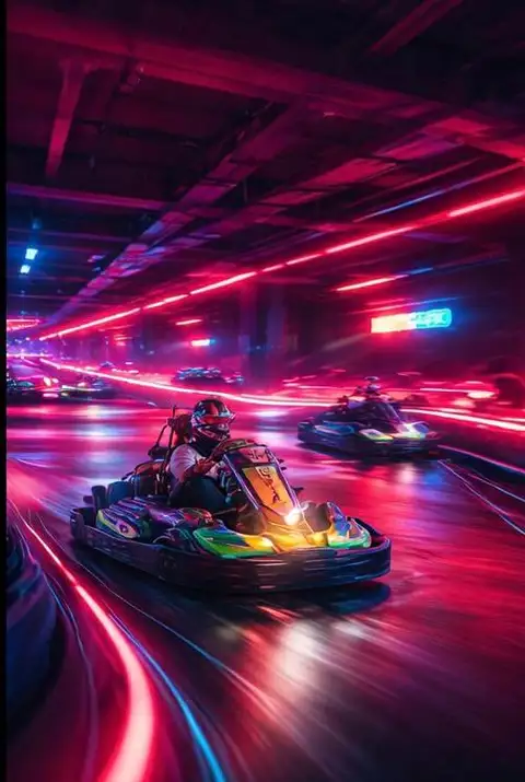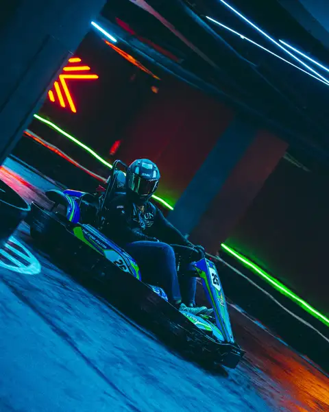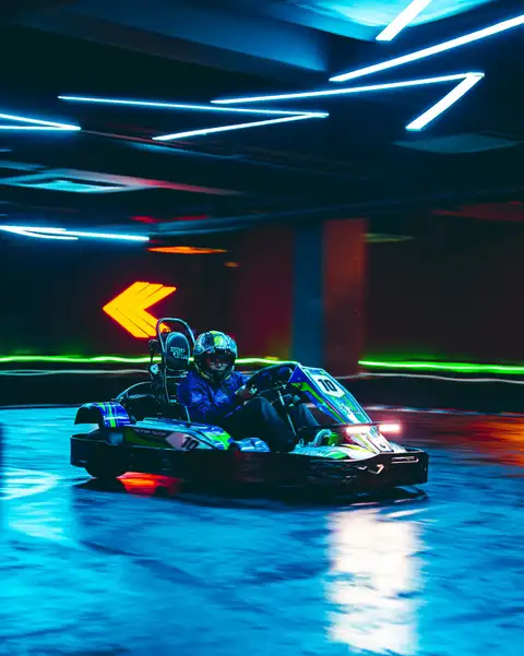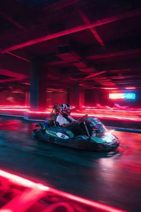 • Step into the neon-lit indoor arena and get ready for your race session.