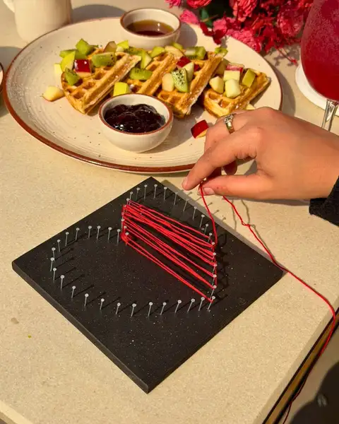 • The experience ends with guests admiring their finished piece and taking home their handmade string art creation.
