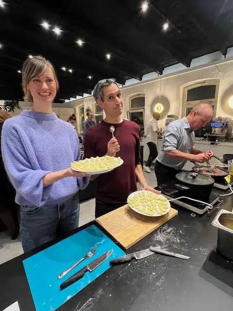 • Teams learn to make their own Neapolitan-style pizza, fresh gnocchi, baked aubergine parmesan and chicken in red wine sauce, with the host providing guiding techniques and tips.