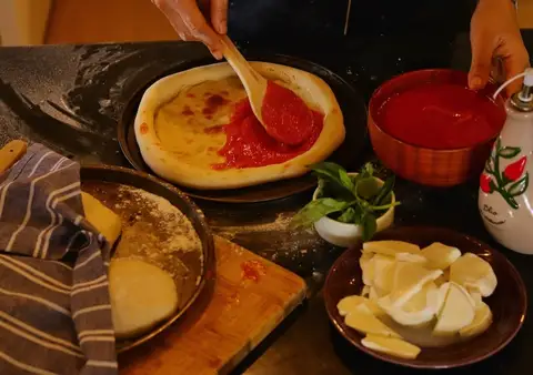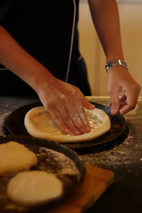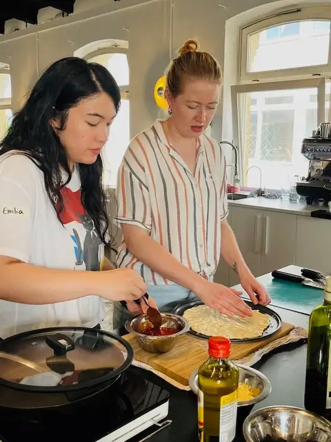 • The group is divided into small teams, each taking charge of different parts of the meal, from dough prep to sauces and sides.