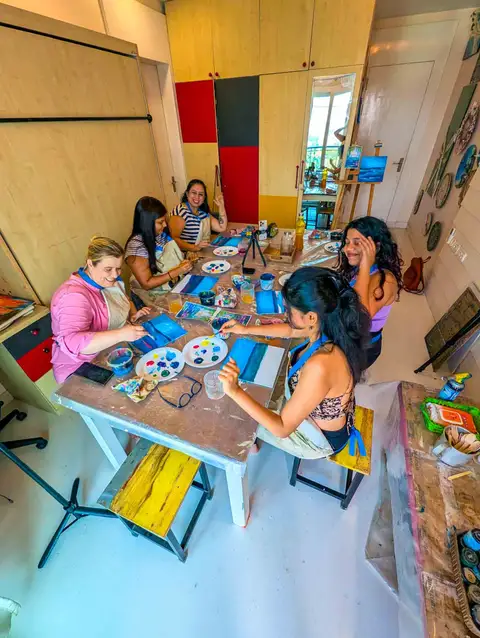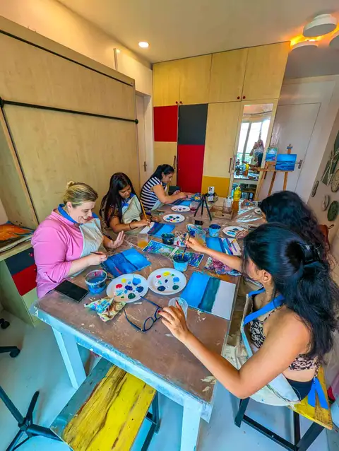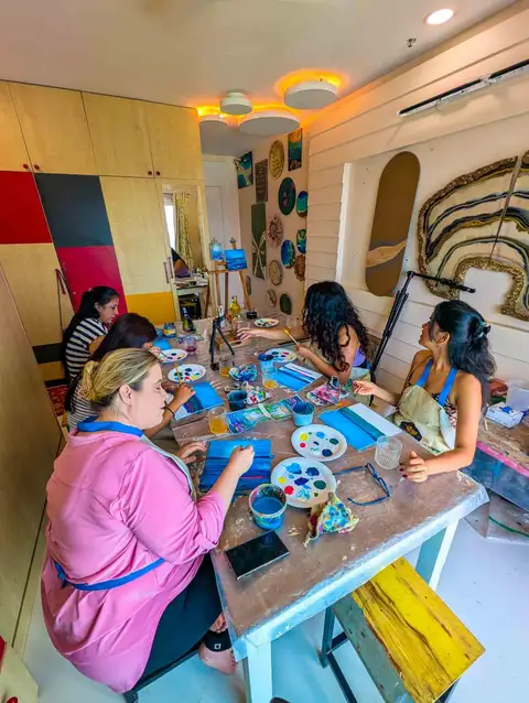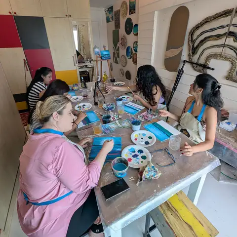 The process is demonstrated visually as participants follow along step by step, with each stage clearly explained—including colour mixing, brush techniques, and layering.