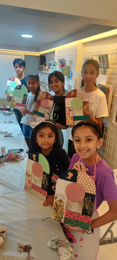 Explore mixed media techniques using colours, textures, paper elements, and layered details.